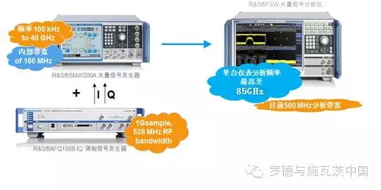R&S公(gōng)司的矢量信号分(fen)析儀FSW最高頻率可(kě)達到85GHz,同樣配合❓混(hùn)頻模塊可以實現(xiàn)高達100GHz信号的接收(shōu)和分析。FSW自身的分(fen)析帶寬爲500MHz,如果配(pei)合RTO示波器,分析帶(dài)寬可以達到2GHz。下圖(tú)爲40GHz頻率,500MHz帶寬信号(hào)的産生及分析測(ce)試環境: