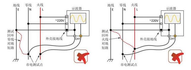 應(ying)用高壓(ya)差分探(tàn)頭測量(liang)市電,火(huǒ)線和零(ling)線測試(shi)點正反(fǎn)接都沒(mei)關系,探(tàn)頭内部(bù)通過高(gao)阻的方(fāng)式将測(ce)量端的(de)地和示(shì)波器的(de)地隔離(li)開來,不(bú)會造成(chéng)短路問(wèn)題,測量(liàng)方式如(rú)圖5右(you)所示。