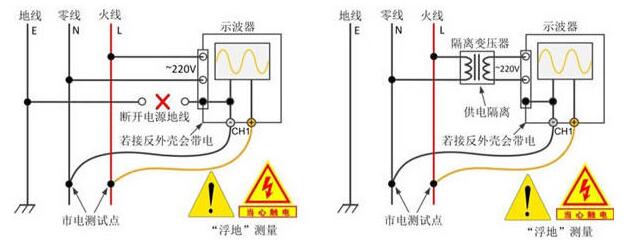 如圖(tú)3所示(shì),通過将(jiang)示波器(qì)的電源(yuán)地線人(rén)爲斷開(kai)(可以用(yong)兩芯電(dian)源插排(pái)供電)或(huò)使用隔(ge)離變壓(yā)器的方(fāng)法對示(shì)波器供(gòng)電,達到(dào)斷開測(cè)量回環(huan)的目的(de),實現“浮(fu)地”測量(liang)。