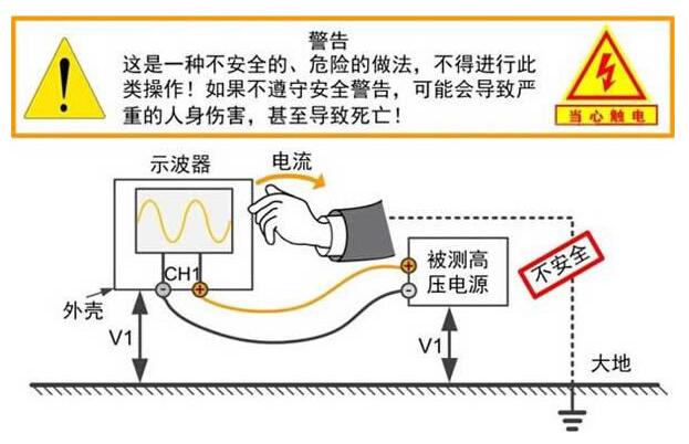 浮(fú)地測量(liang)時,示波(bō)器外殼(ké)金屬端(duan)和探頭(tóu)接地端(duān)帶有同(tóng)等電平(ping)。當測量(liàng)市電時(shi),外殼可(kě)能帶有(you)220V的電(dian)壓,人體(tǐ)一旦接(jiē)觸到示(shì)波器外(wài)殼,電流(liú)會經過(guò)人體流(liu)入大地(di),非常危(wei)險!