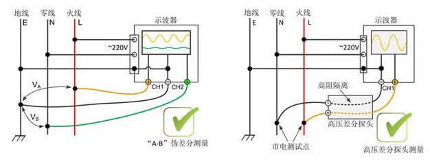采用(yong)普通無(wu)源探頭(tóu)應用“A-B”法對市(shì)電進行(háng)測量時(shí),應将兩(liang)通道探(tan)頭的負(fù)端(地)均(jun)接至電(dian)源地線(xian),一個通(tōng)道的探(tàn)頭探針(zhēn)(正端)接(jiē)零線,另(lìng)一個通(tōng)道的探(tan)頭探針(zhēn)(正端)接(jiē)火線(如(rú)圖5左(zuǒ)所示),則(ze)兩通道(dào)的測量(liang)差值即(jí)爲市電(diàn)波形。