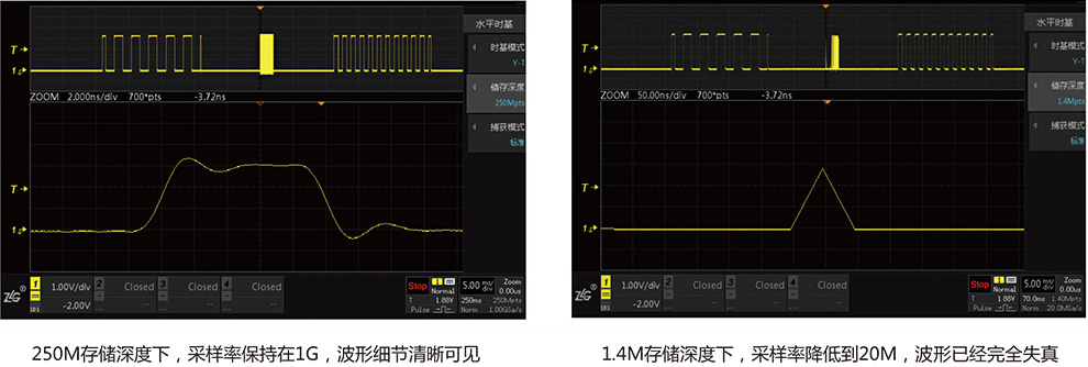 如果(guǒ)存儲深度能(néng)夠做到足夠(gou)大,就能保持(chí)最高的波形(xíng)采樣率,則觀(guān)察到的波形(xíng)會更加真實(shi)、細膩。反之,如(rú)🈲果存儲深度(du)隻有1Mpts甚至更低(dī),當要觀察時(shí)長較大的波(bo)形時,示波器(qi)就隻❓能被迫(pò)降低采樣率(lü)。由于采樣點(diǎn)數不足,示波(bo)器顯示的波(bo)♌形也會嚴重(zhòng)失真,甚至産(chǎn)生波形混疊(dié),誤導用戶測(ce)量分🤞析。
