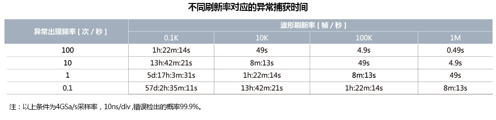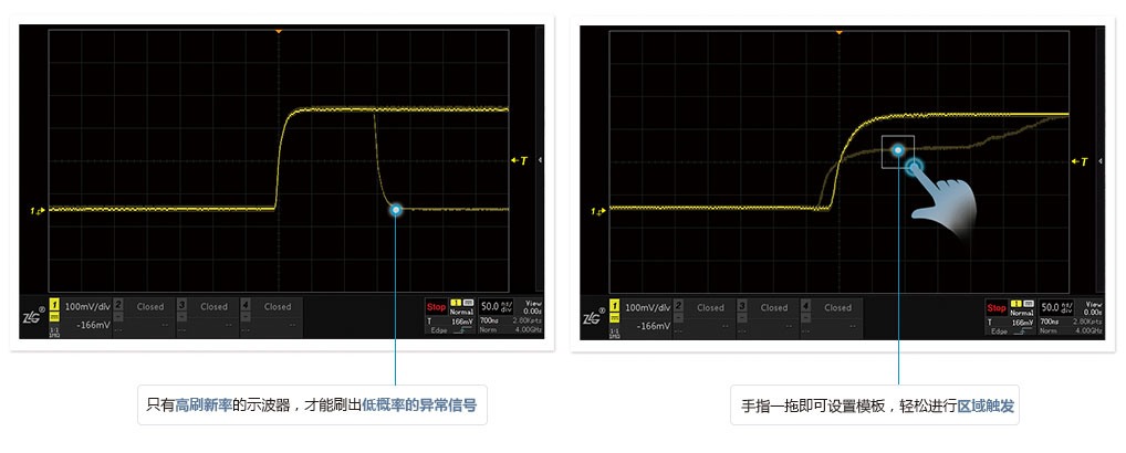 波形刷(shua)新率越(yue)高,死區(qu)時間就(jiù)越短。ZDS4000系列示(shi)波器,标(biao)配業界(jie)最高的(de)1M次波(bo)形刷新(xin)率,配合(hé)模闆觸(chù)發,讓您(nin)最大概(gài)率的發(fā)現并捕(bu)獲異♊常(chang)信号。