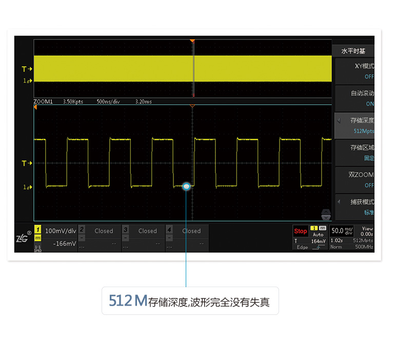 存儲深度(du)等于采樣(yàng)率乘以采(cai)樣時間,512M超(chāo)大存儲深(shēn)😄度,長時間(jiān)捕獲波形(xíng),依然不會(hui)出現波形(xíng)失真。