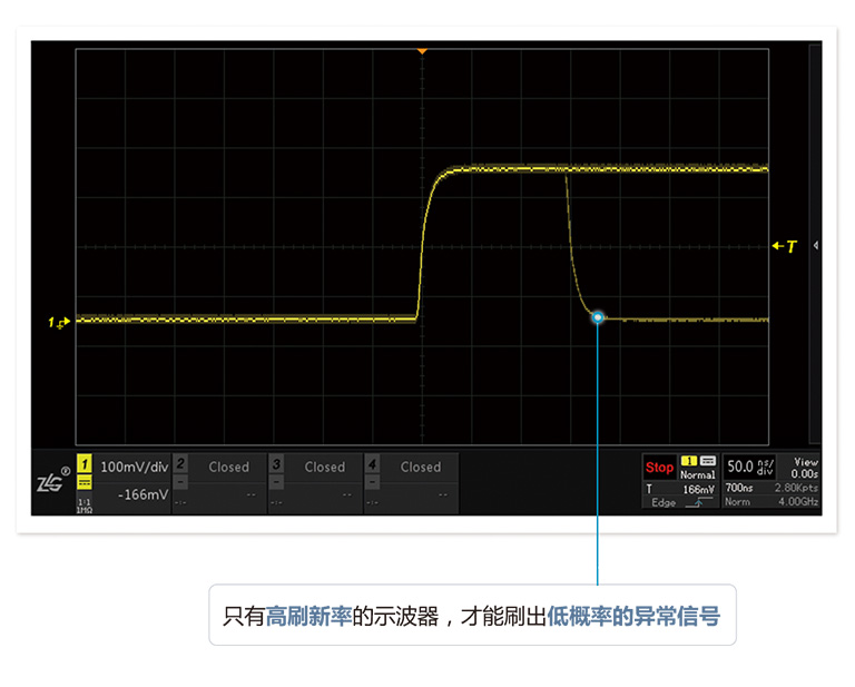 波形(xíng)刷新率越(yue)高,死區時(shi)間就越短(duǎn)。ZDS4000系列示波(bo)器,标配業(yè)😄界最高的(de)1M次波形刷(shua)新率,配合(he)模闆觸發(fa),讓您最大(da)概率的發(fā)👅現并捕獲(huo)異常信号(hao)。
