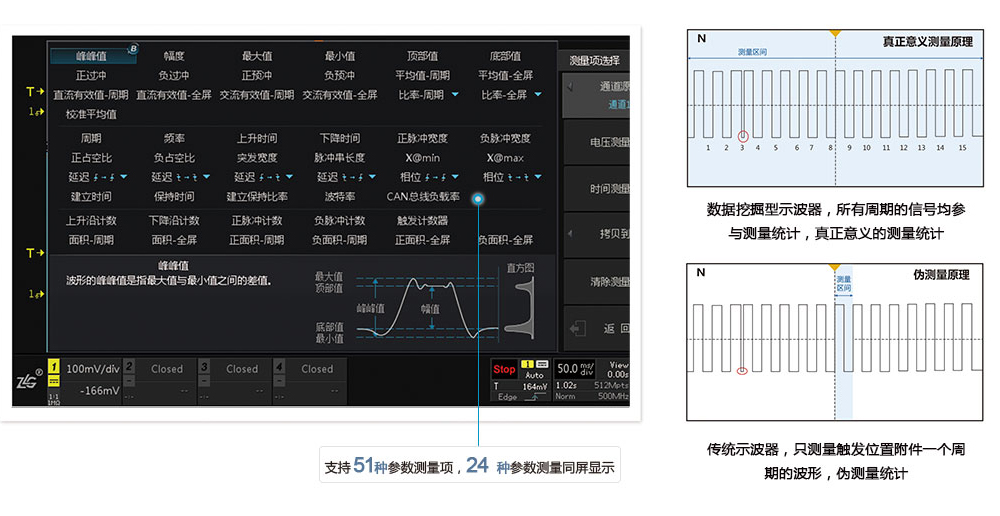 不(bú)同于傳統(tong)示波器隻(zhī)測一個周(zhōu)期,或通過(guò)抽樣減少(shao)數據量再(zai)測量的模(mo)式,ZDS4000系列示(shi)波器通過(guò)FPGA全硬件😍并(bìng)行處理,基(ji)于原始采(cai)樣率和512Mpts全(quán)存儲深度(dù),對每一幀(zhēn)波形每一(yi)周期進行(háng)測量統計(ji),僅需約1秒(miǎo)即可實現(xiàn)對512Mpts數據的(de)“真正意🎯義(yi)”參數測🏒量(liàng),測試項目(mù)可達51種,并(bing)且支持24種(zhǒng)參數同時(shi)顯示。這與(yǔ)傳統意義(yi)示波器的(de)測量有着(zhe)本🔞質的區(qu)别,也是示(shi)波器測試(shi)手段與測(cè)試方法的(de)重大㊙️突破(po)。