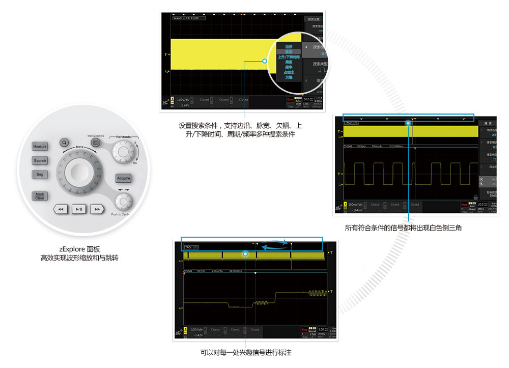 ZDS4000系列(liè)示波器不(bú)隻提供了(le)512M的波形大(dà)數據,還配(pei)有強大的(de)波形搜索(suo)功能和智(zhi)能标注功(gōng)能。您可以(yi)先通過邊(bian)沿、脈寬、欠(qian)幅、上升/下(xià)降時間、周(zhou)期/頻率等(deng)多種搜索(suo)條件來定(ding)位512Mpts波形數(shu)據中的異(yi)常點,再對(duì)找出的異(yì)常信号使(shǐ)用标注功(gong)能,對異常(chang)信号進行(hang)标注。這裏(li),所有的測(ce)量都是經(jing)過FPGA全硬件(jian)加速,整個(gè)過程1S左右(you)即可完成(cheng)。再對找出(chū)的異常信(xìn)号使用标(biāo)注功能,對(dui)異常信号(hào)進行标注(zhù)。