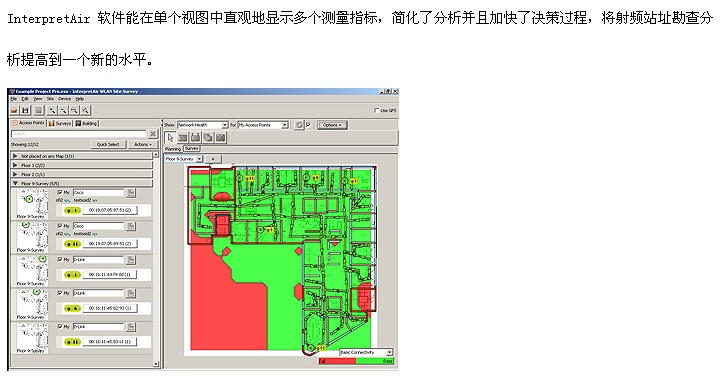 InterpretAir 爲無線局(jú)域網施工人(ren)員和網絡專(zhuān)業人員提供(gòng)他們在規劃(huà)、模拟、驗證和(hé)記錄 802.11a/b/g 無線局(ju)域網網絡時(shi)所需的透視(shì)能力。InterpretAir 是一種(zhǒng)無線站址勘(kan)查工具,而且(qie),它能直觀地(dì)顯示射頻健(jian)康指标,大幅(fú)度簡化無線(xiàn)局域網環境(jing)分析并實現(xian)性能調整。搜(sou)索無線局域(yù)網網絡性能(néng)未達最佳程(chéng)度的位置并(bing)發現原因,提(tí)前解決可能(néng)會影響移動(dòng)應用性能的(de)問題。