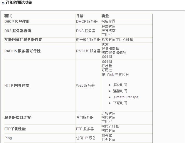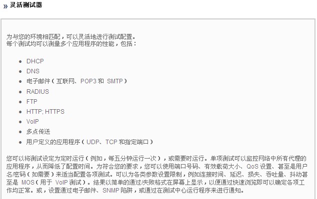 使(shǐ)用應用(yòng)程序庫(ku)測量 實(shi)際的應(yīng)用程序(xu)性能,包(bao)括 HTTP、FTP、DNS、電子(zi)郵件、VoIP、ping 或(huò)使用靈(ling)活設置(zhi)定義您(nin)的應用(yong)程序性(xìng)能